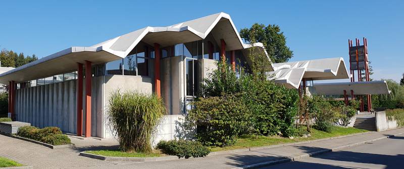 Unscheinbar, zurückhaltend, geprägt von einem rhythmisch gefalteten Betondach, weich eigebettet ins Wohnquartier. So präsentiert sich die Bruder Klaus-Kirche. Die wahre Grösse des Baus erschliesst sie uns erst, wenn wir den gewaltigen, schlichten Raum betreten. Die rohe Betondecke überspannt stützenfrei die gesamte Fläche. Schuppenartig aneinandergereihte Betonelemente umschliessen den Raum. Aber nicht die Schwere des Betons, sondern die Leichtigkeit der Fensteröffnungen zwischen Wand und Decke und die Lichtbänder innerhalb der Dachkonstruktion prägen das Gefühl einer lichtdurchfluteten Grosszügigkeit.